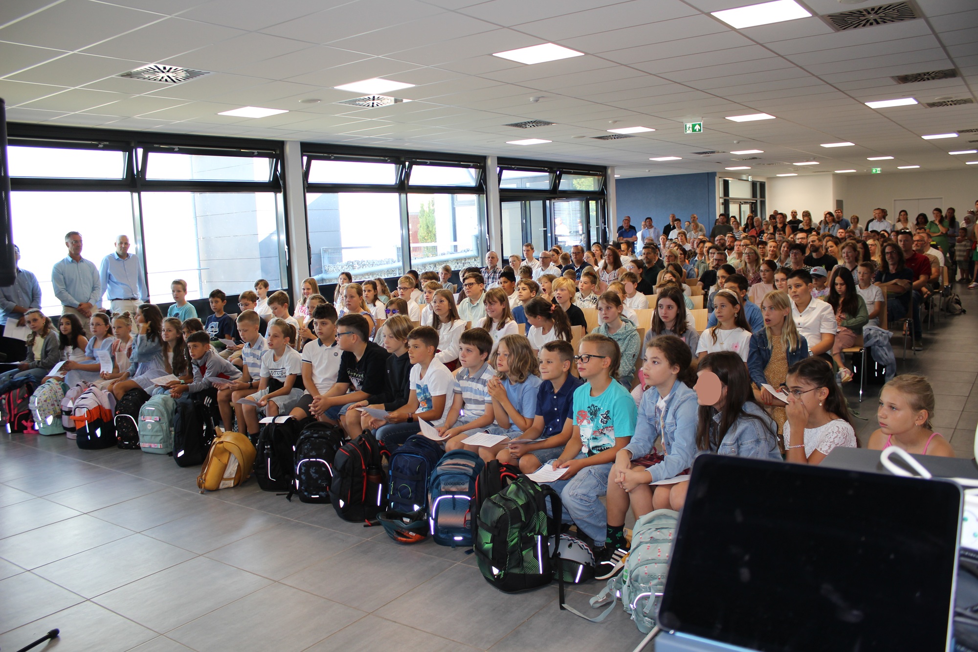 Am 18. August war es endlich soweit: Das Gymnasium Rheinzabern öffnete zum allerersten Mal seine Türen. Aufgeregte Kinder, stolze Eltern und das neue Kollegium füllten das Foyer der Sporthalle, wo die Schulgemeinschaft mit Musik, Reden und kleinen Willkommensgesten den Auftakt feierte.
